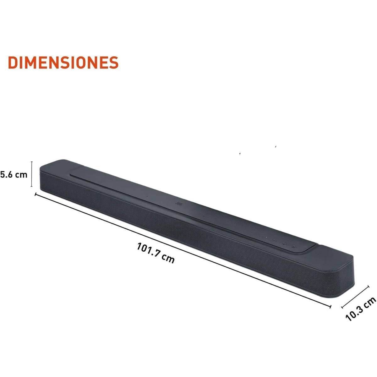 JBL Sound Bar بتقنية الصوت المحيطي السينمائي Dolby Atmos® ثلاثي الأبعاد، نظام صوت محيطي بـ 5.1 قناة، إجمالي الطاقة 590 واط، مضخم صوت لاسلكي مقاس 10 بوصات، تقنية تحسين الحوار PureVoice مع MultiBeam